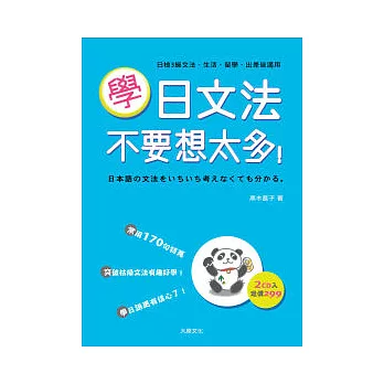 從今天起,《學日文法不要想太多》將徹底改變您過去對「日文法學習世界」的感觀!翻開本書,您會看到都是日本人整理好的文法,只要照著用就行啦!而且突破過去一成不變的解說模式,在這裡就是要給您說個清楚,講個明白。還有,每項文法更創新地大量採用活潑動感的漫畫插圖,上面趣味逗人的小故事,看了肯定讓您終身難忘。當然!每項文法為了配合生活、旅遊、工作、時事等內容,都附上5個例句,為的是幫助您在例句中發現文法、在例句中活用文法喔!