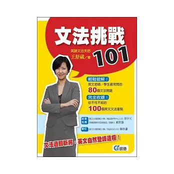 補教權威王舒葳老師,以深厚的英語教學專業及豐富的經驗,將英文文法濃縮成20個單元,給你系統化的有效學習,再加上80個最常見的文法問題,各種疑難雜症一次破解。還在擔心你的文法沒救了嗎?別害怕!趕快打開《文法挑戰101》,從頭開始檢視你的文法問題,無論你是學生、上班族,或是英文老師,保證一定讓你看得懂、記得快、學得好!
